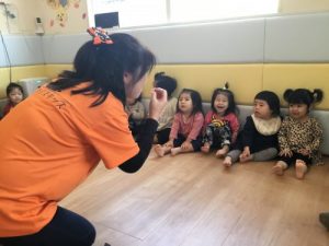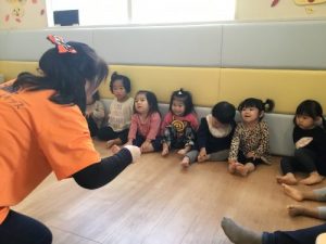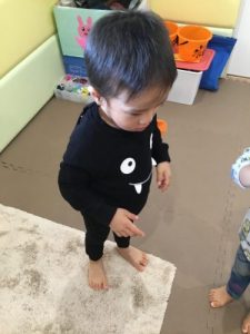 ハロウィンってなんだろう、怖いものなのかな?「ううんぜーんぜん怖くないよ。」「外におばけさんがいるからね、見つけるんだよ~。みんなが頑張ってオバケさんを見つけたらシールがもらえるよ。最後におやつももらえるからみんな頑張れるかな〜?」と先生に説明をしてもらうと、初めはおばけに対して怖くて顔がこわばっていた子もいましたが、話を聞いていくうちに頑張ってみよう!  え、おやつ!と目を輝かせ頷いている子もいました!