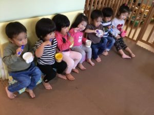 11月から2歳児クラスは、給食後に歯磨き指導も始まりました。