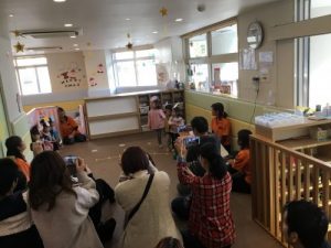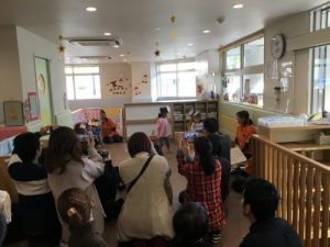 0、1歳児の子ども達はなんだかいつもとは雰囲気が違うな〜という感じていましたが、普段通りに朝の会、そしておやつを食べました。