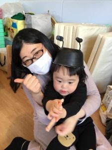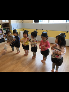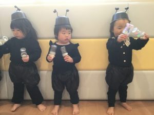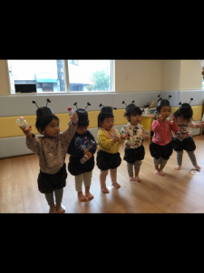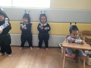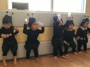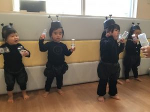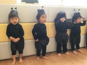 1歳児さんはなんとアリの格好をして’ありさんのおつかい’’おりさんのおはなし’を演奏しました。幕が閉まっている時はニコニコだったものの、幕が開きお父さん、お母さんが目の前に現れると固まってしまいました?