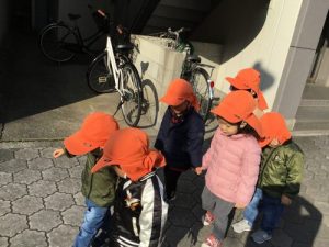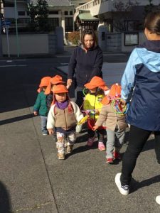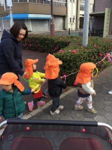 2歳のお友だちは、散歩中、友だちと手をつないで2列でまっすぐ歩くことに取り組んでいますよ。