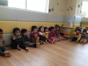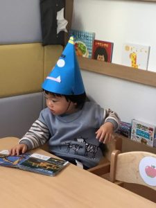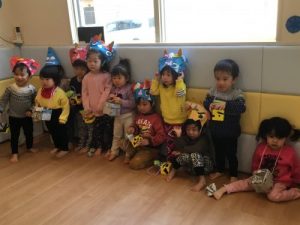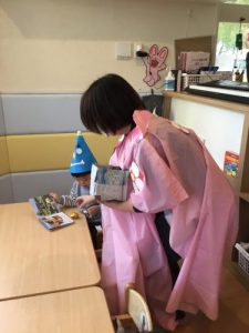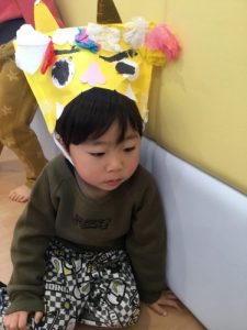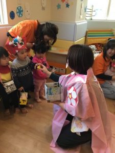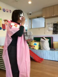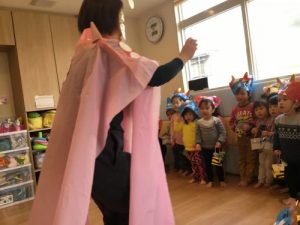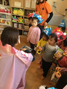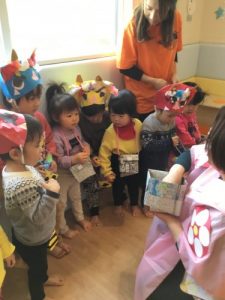 ’うさぎのみみちゃん おにわそとー!’の紙芝居を読みました。子ども達は鬼がどうなるのか興味深々。