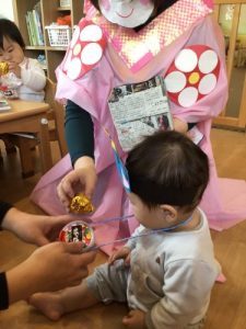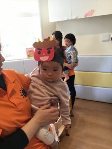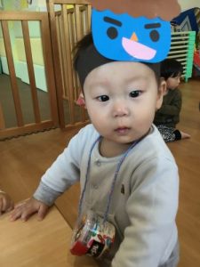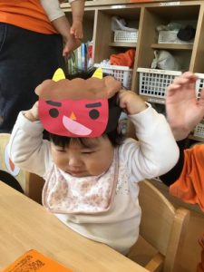 「おには~そと!」とやっつけている姿を見て、1才児の子ども達も「えい!えい!」と豆を投げていました。