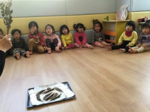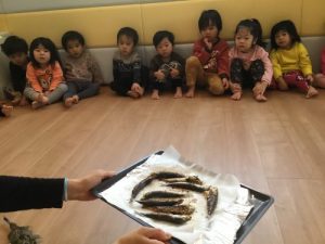 その後は、子ども達がひいらぎとイワシ子ども達がで作った「やいがしら」を、なぜ「やいがしら」なの?かのお話を聞きました。