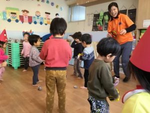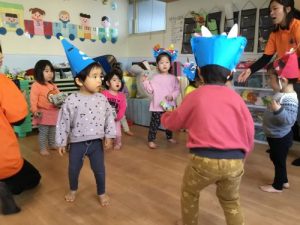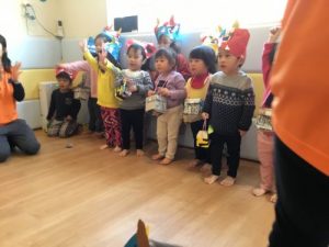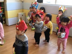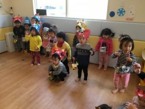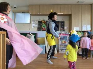 みんなで’鬼のパンツ’を歌おうと盛り上がっていると、福の神と鬼さんがやってきて、一緒に仲良く歌いました~♪