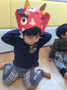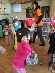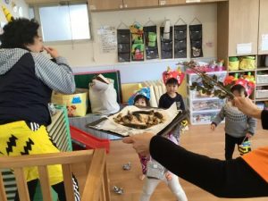 「いくよ~せーの!」という声掛けで豆まき大会が始まりました。「キャ――」と逃げ回る女の子鬼?