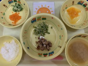 軟飯 味噌汁 チキンソテー ゆで野菜 おかか和え みかん