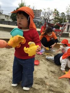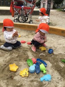 今日は一歳児クラスと一緒に砂場遊びをしました。