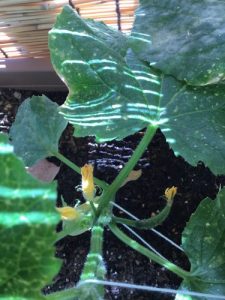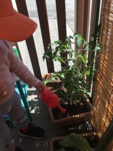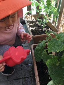 トマト、キュウリの苗も日に日に大きくなってきました。トマトはもう緑色に膨らんでいます!
