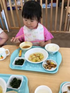 名古屋港園では、分補給とホットタオルで身体を拭いてさっぱりしてから給食を食べるようにしています。