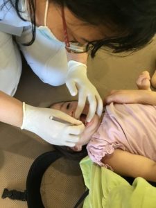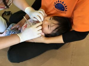 前の日や前の週に子ども達に’はみがきあそび’の絵本を読んだあと、みんなは誰に歯を磨いてもらうのかを聞くと「ママとやるの」「ネーネだよ」とみんな誰と磨いているのかを教えてくれました。