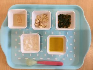 【離乳食(後期)】 エネルギー176kcal たんぱく質5.8g 脂質2.0g 粥 玉ねぎスープ 豆...