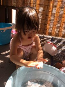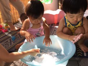 水遊びでは片栗粉に触れてみたり、、、?