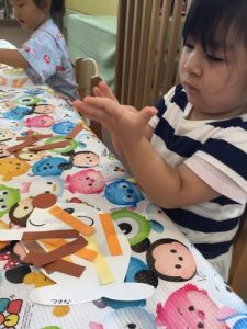 自分で指に糊を取り、丁寧に時間をかけて塗っている子や同じところに何枚も重ねて塗ってみたり、ハリネズミの頭に貼り、「カミノケ~!」と自分でアレンジして見みたり、個性豊かなハリネズミさんが完成出来ました~~!