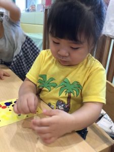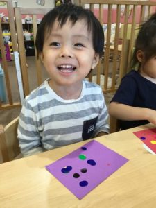 2歳児クラスは 製作でシールを貼ったりしていました。 何の製作かな? 秋の味覚?