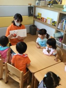 こんにちは 名古屋港園です! サンライズキッズでは 読み聞かせに力を入れています。 今日は 1歳児は...