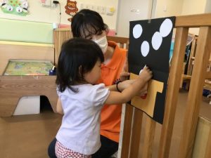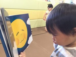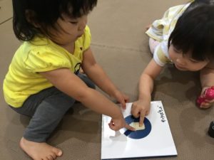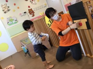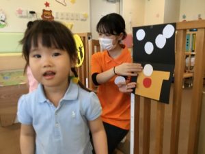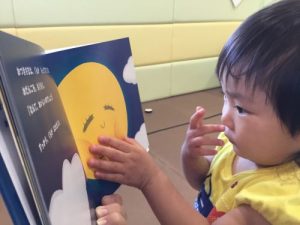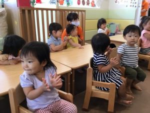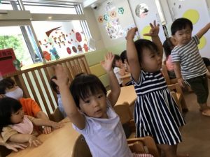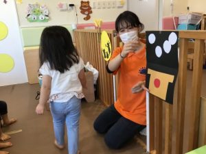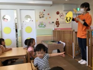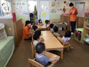 先生が「まずは絵本読もうかな〜手遊びやってみようか」というと、子どもたちはニコッと笑って手遊びに夢中でした。