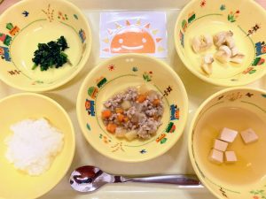 粥 すまし汁  じゃが芋のそぼろ煮 ほうれん草の煮浸し バナナ