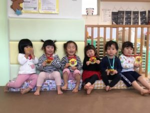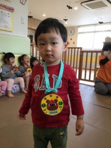 最後に いっぱい がんばったね!と 先生手作りのメダルをもらってにっこり