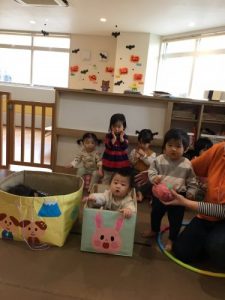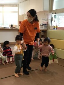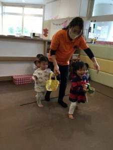を 歌いながら 保育士と歩いて行き 自分のマークの見つけて かばんに入れるというもので どの子もとっても楽しそうに参加していました
