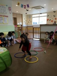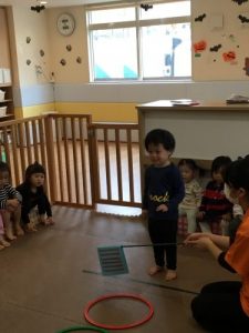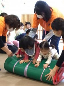 2歳児さんはかけっことアンパンマンに柿を届けよう(ケンケンパ トンネル ボール入れを取り入れた サーキット遊び)その他に 丸太ころがし 玉入れもやりました。