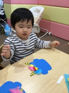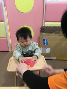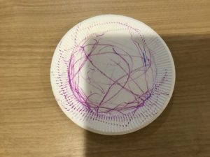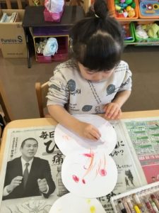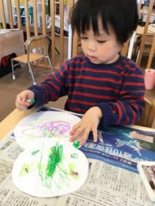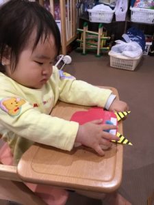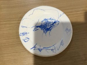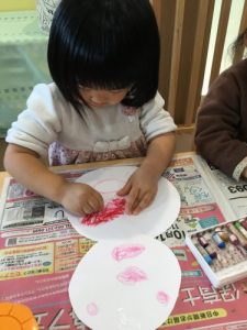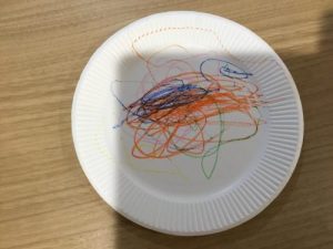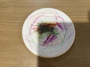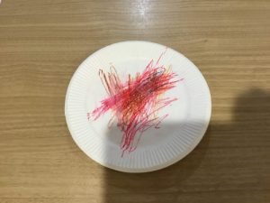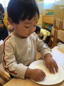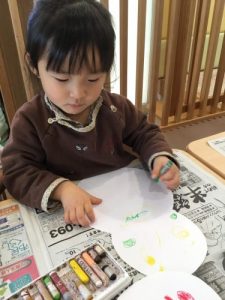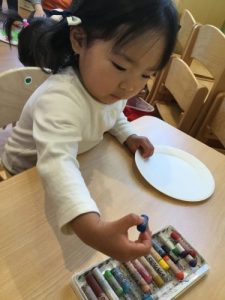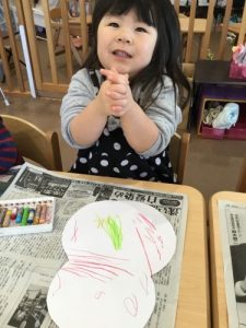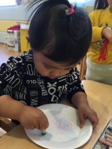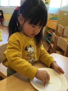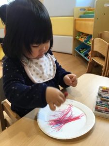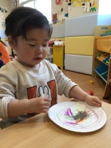 1才児いちご組の子ども達は紙皿を使ってお絵かきをしましたよ。