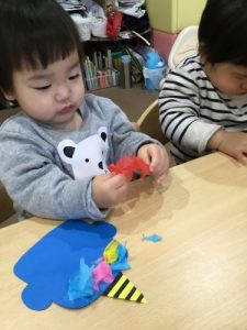 小さなかわいい手でお花紙をクシュクシュ。