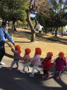 外遊びでは みんなでんしゃごっこ♪ 上手に前のお友だちにくっついて歩けたね