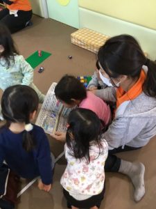 名古屋港園では さまざまなジャンルの絵本があり こどもたちが自由に手に取れる位置においてあるので みんなお気に入りの本を持ってきては 先生に読んでもらっています。