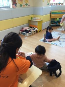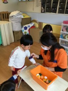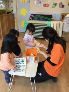手作りのお金のおもちゃを使い、「これください!」「どうぞ!」などお店側とお客側になりきりやり取りの練習とお金を渡して物を買う練習をしていました?