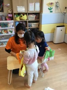一人ずつ鞄を持ち、準備万全な姿がとっても可愛らしい1歳児さんです?