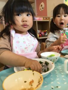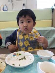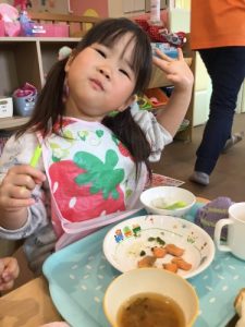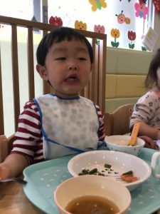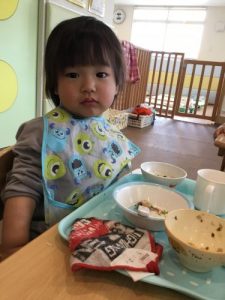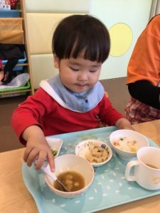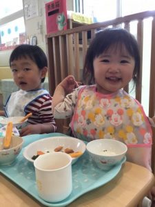 散歩の後は、大好きな給食の時間。
