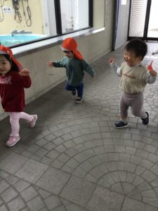 慣れない防災頭巾を被る事に泣いてしまうお友達の姿も見られましたが、
