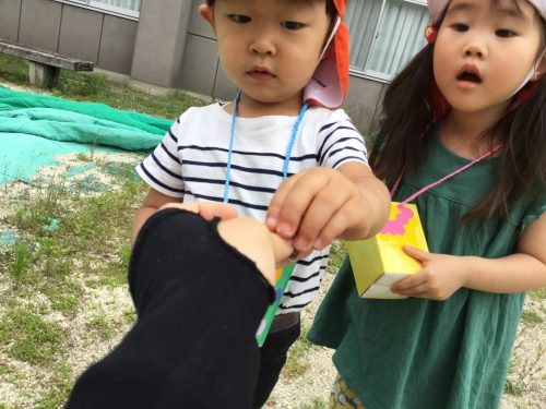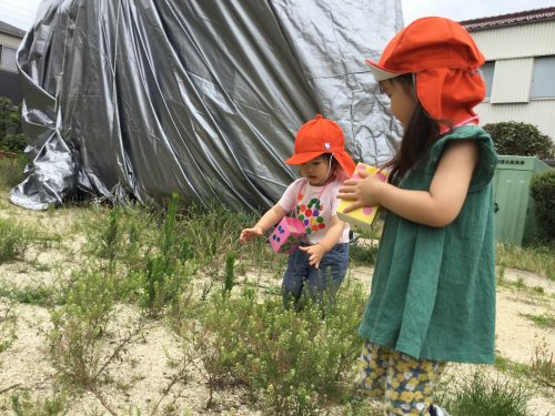 ちょうちょを捕まえようと、お外では手作りの虫かごを持って行きました!
