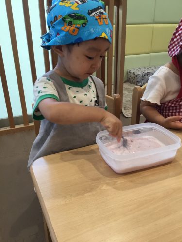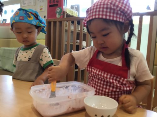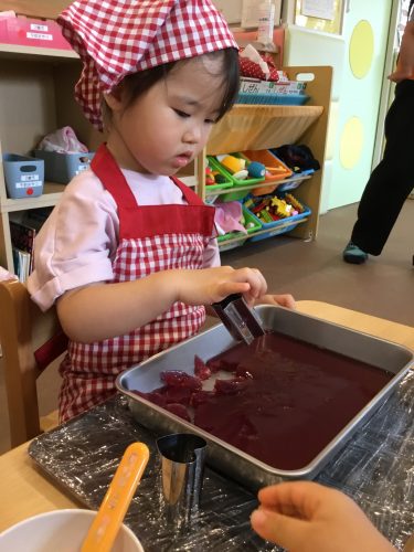 まぜまぜしたり、寒天で型抜きしたりと真剣に取り組んでいた子ども達。