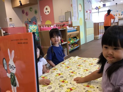 子ども達もおばけが出てきた時は”おばけ”と緊張する姿がありましたが、読み進めていくうちに、おばけが必死になってメガネを探す姿が愛らしく思えてきたようで「ないね〜めがね」と笑っていました。