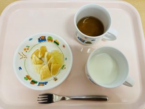 粥 味噌汁 豆腐と野菜のくず煮 スティック野菜 粉ふき芋