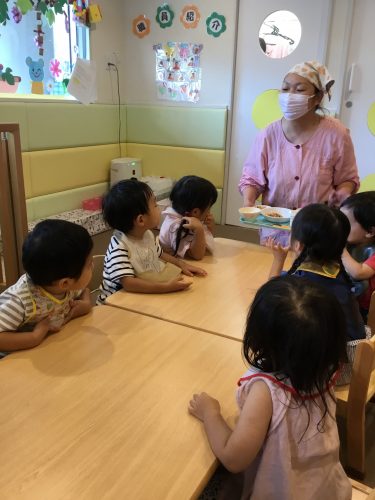 2歳児クラスのお友だちが、元気よく栄養士さんを呼び、
