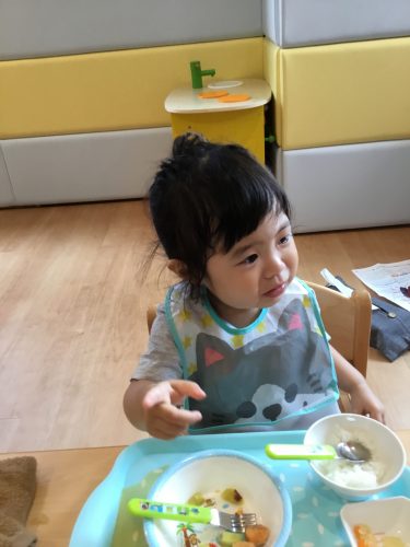 お給食が気になって仕方がない様子、でもしっかりとお話も聞いています。