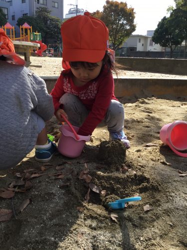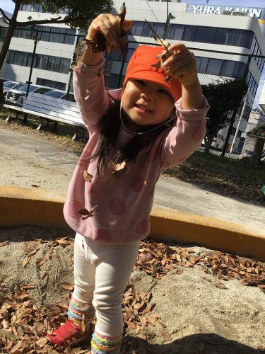 落ち葉を集めてバケツの中に入れちゃおっ!
