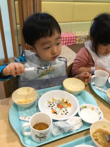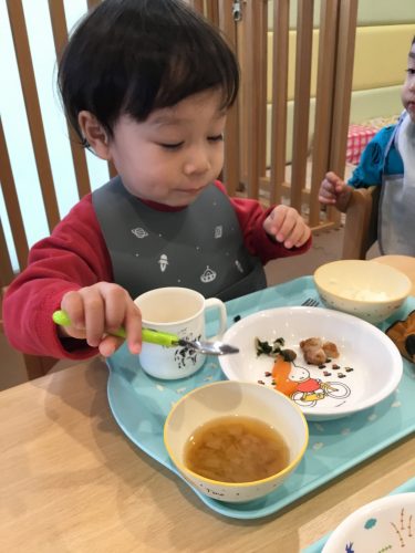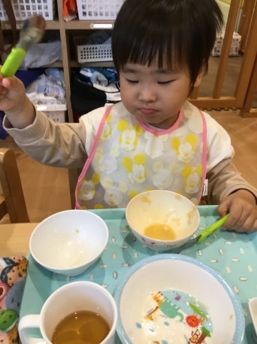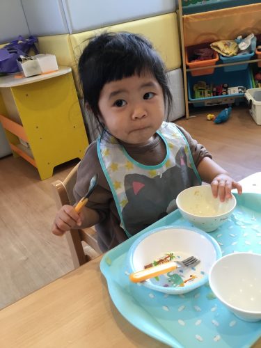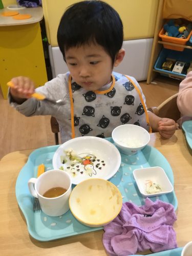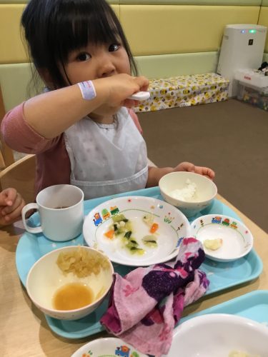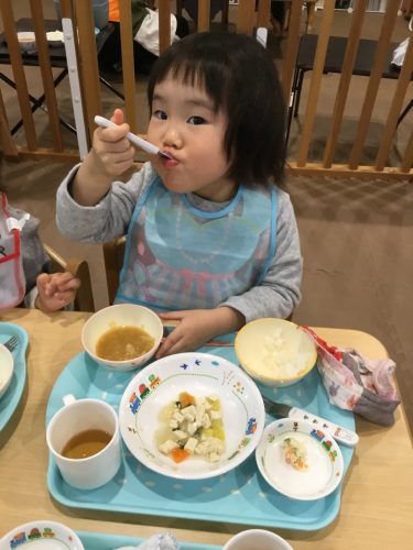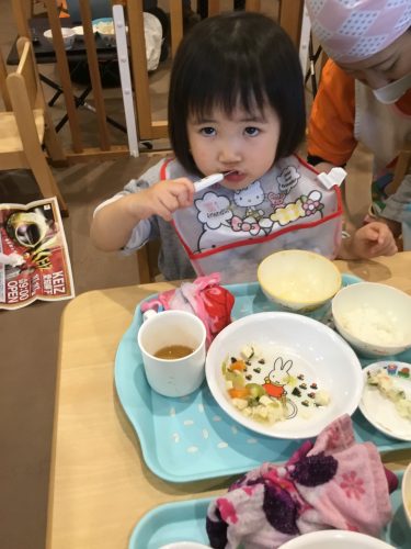 「はしをつかう〜」「◯◯おかわりする〜」など意思表示もしっかりと出てきて伝えてくれています。友だちや保育士との会話も楽しんでいます。