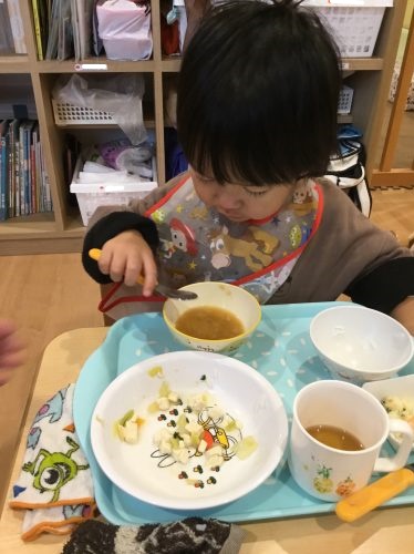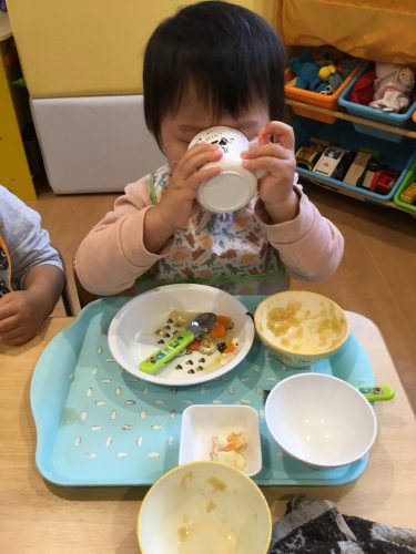 1歳児では、嫌いな食べ物も出てきて自分ではなかなか進まない姿もめにしますが、保育士が声掛けを行いながら、少しずつ苦手な食材を減らすようにし、楽しみながら食べられる雰囲気作りを大切にしています❣️