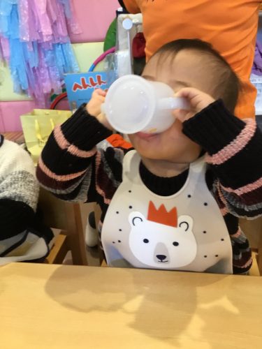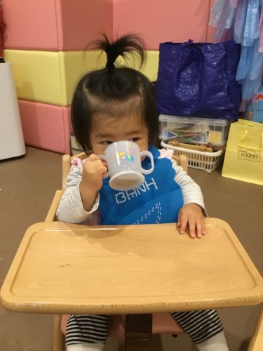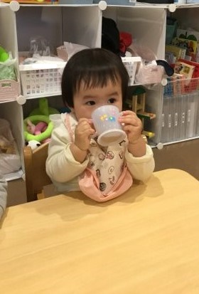 コップを《もちもち》と保育士が声を掛けると、自分で手に持ってお茶を飲んでいます。