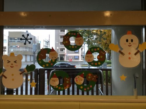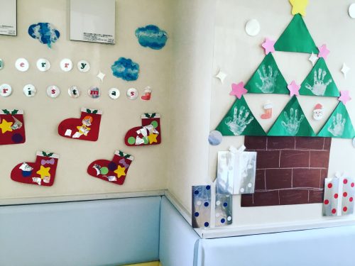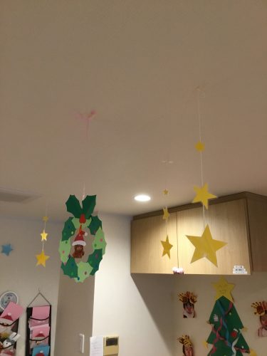 保育室も子どもたちが作ったかわいい壁面や天井飾りでクリスマス一色になっています?