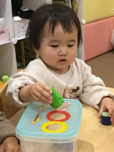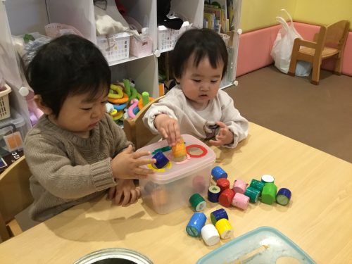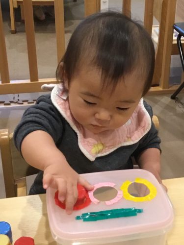 椅子に座ってポットン落とし。テープに巻いたペットボトルの蓋を穴に落としたり、たか〜く積んでみたりして楽しんでいます?