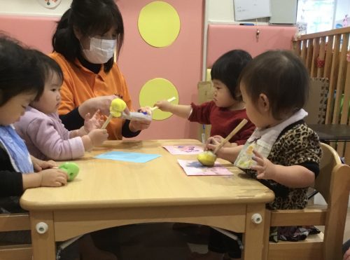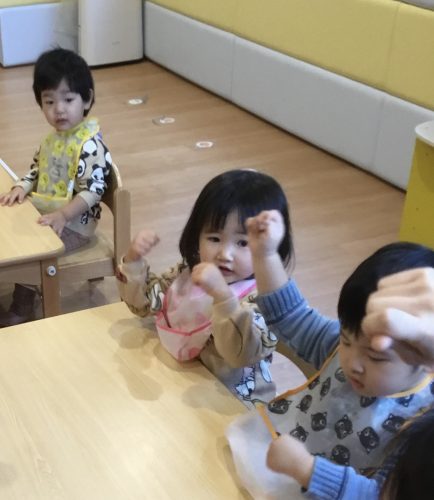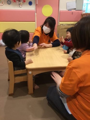 登園のお子様が少ない為、この日は1.2歳合同保育をしていました。