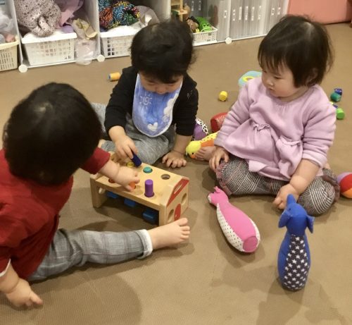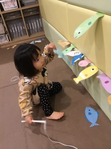 2歳児りんご組さん、始めはお魚釣りをしていましたが、他の遊び方を見つけたようです。