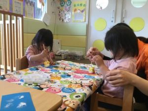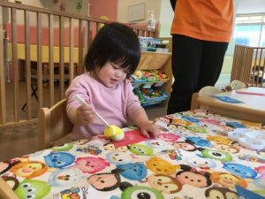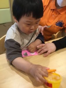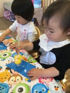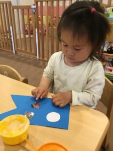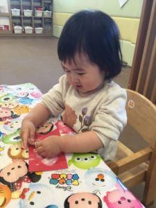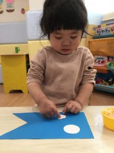 2歳のお友達は指先を使ってのりをぬり、模様をつけましたよ❣️