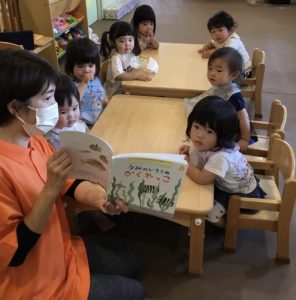 今回の絵本は、1歳児の月刊絵本「うみのいきもの かくれっこ」です。