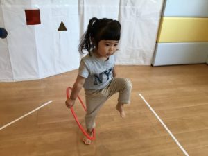 中に入ってバイバイ〜と手を振るお友だちに「電車みたいだね♪」と声をかけると